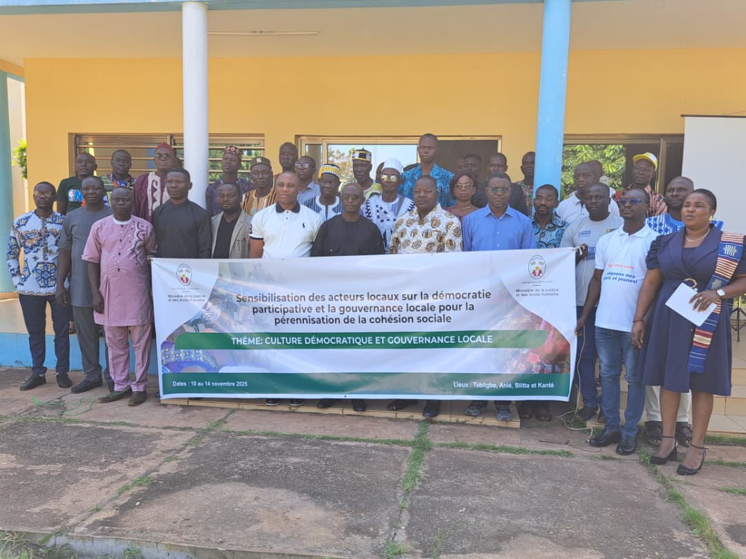 Dans le cadre de son engagement pour la promotion de la démocratie à la base et le renforcement de la cohésion sociale, le Ministère de la Justice et des Droits Humains, à travers la Direction du Renforcement Démocratique, a organisé le 12 novembre 2025 une séance de sensibilisation à Blitta. Cette rencontre s’inscrit dans une série d’activités prévues du 09 au 15 novembre 2025 dans les préfectures de Yoto, d’Anié, de Blitta et de la Kéran, autour du thème : « Culture démocratique et gouvernance locale ».
